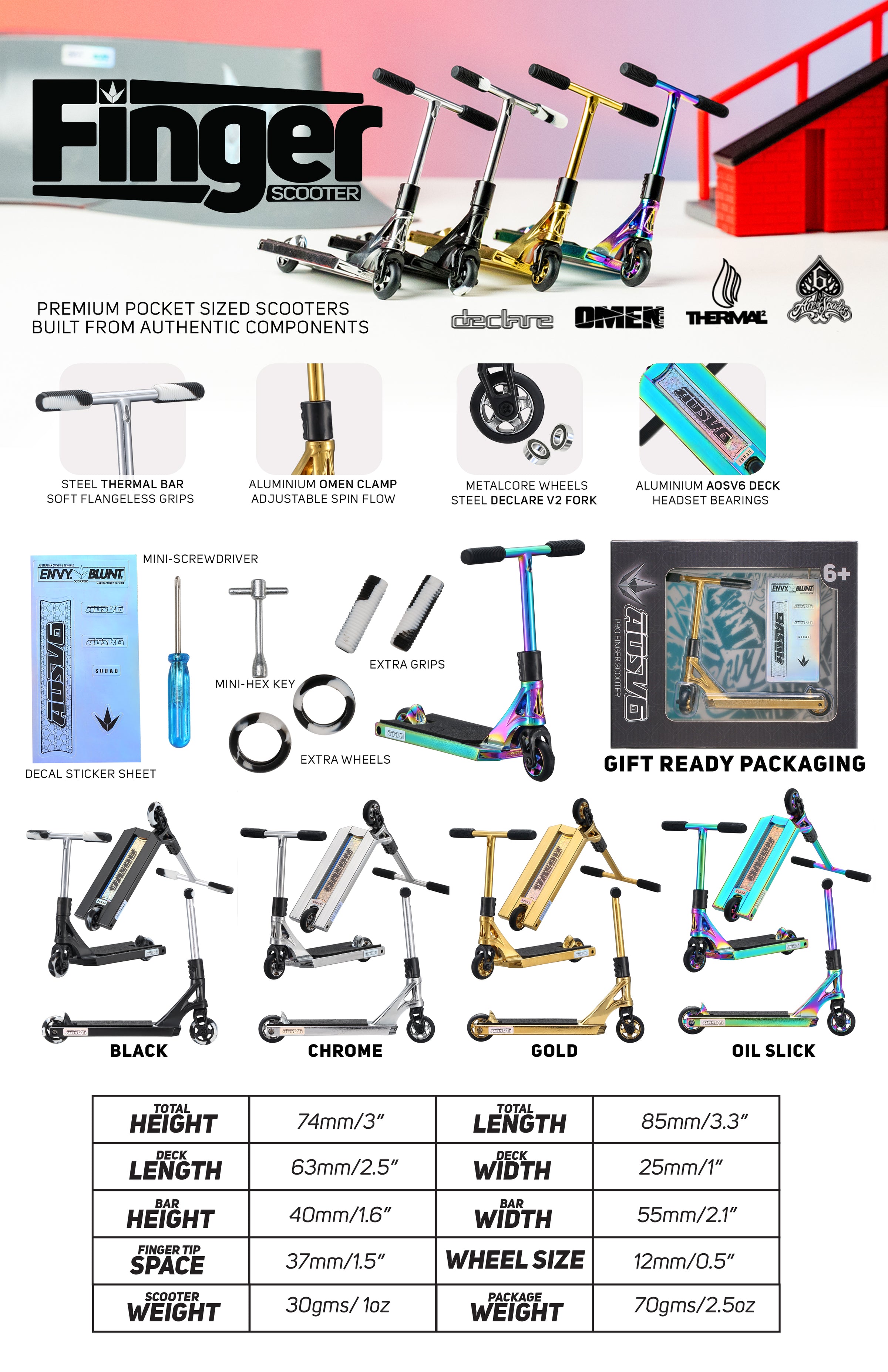 Découvrez vos pièces BLUNT/ENVY préférées d'une toute nouvelle manière. Ces trottinettes à doigts ne sont pas seulement belles, elles sont fabriquées avec des composants authentiques et des roulements de haute qualité, conçues pour dominer la pratique sur table, ou partout où vous ressentez le besoin d'enchaîner une ligne. Fidèle à notre gamme de plateaux AOSV6, notre version trottinette à doigts inclut également un concave réactif offrant cette même sensation de réactivité et ce punch supplémentaire que vous obtenez sur la vraie, contrairement à toute autre trottinette à doigts sur le marché.